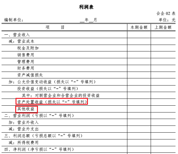 新增“其他收益”行项目,反映计入其他收益的政府补助等。该项目应根据在损益类科目新设置的“其他收益”科目的发生额分析填列。