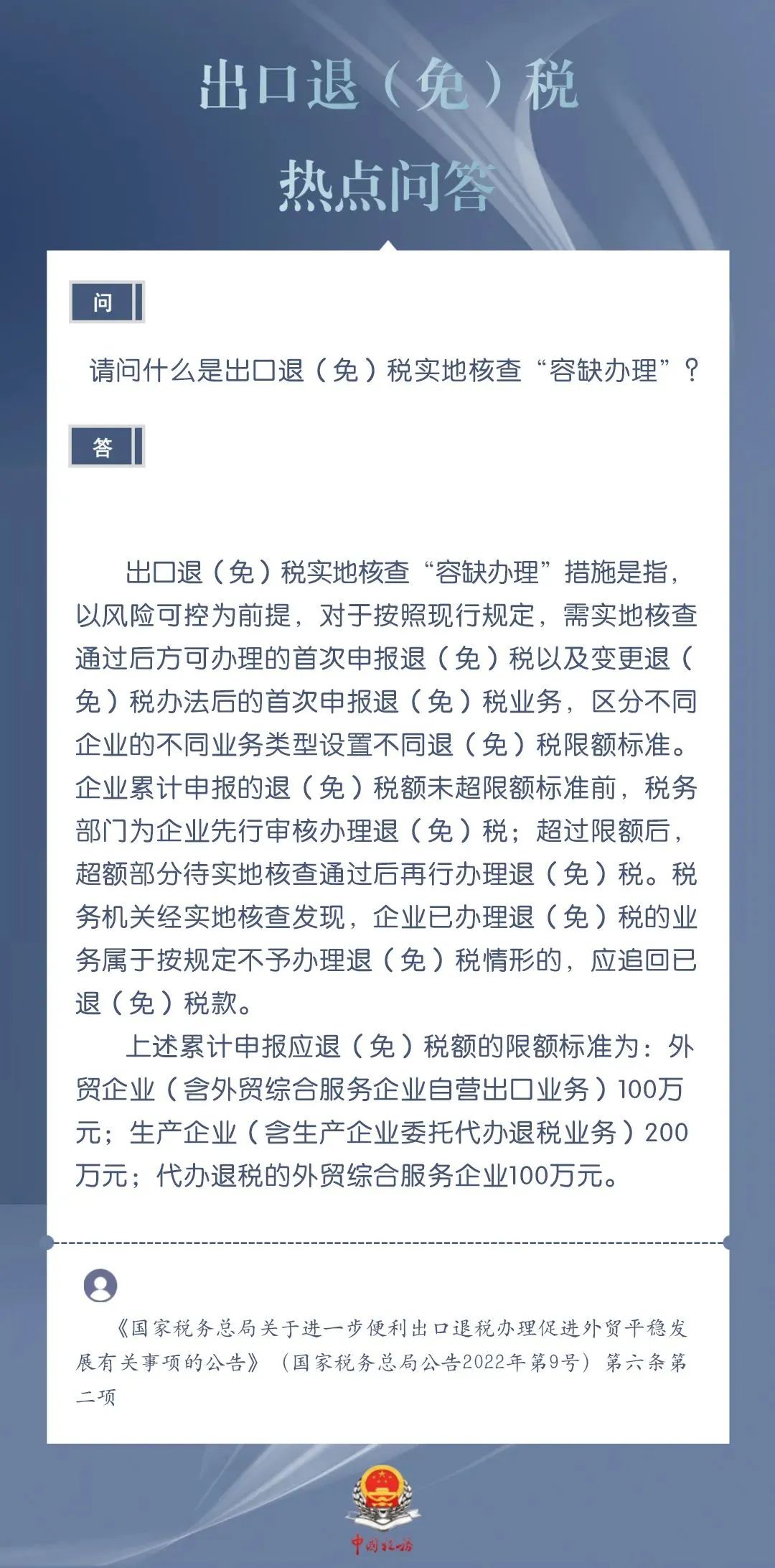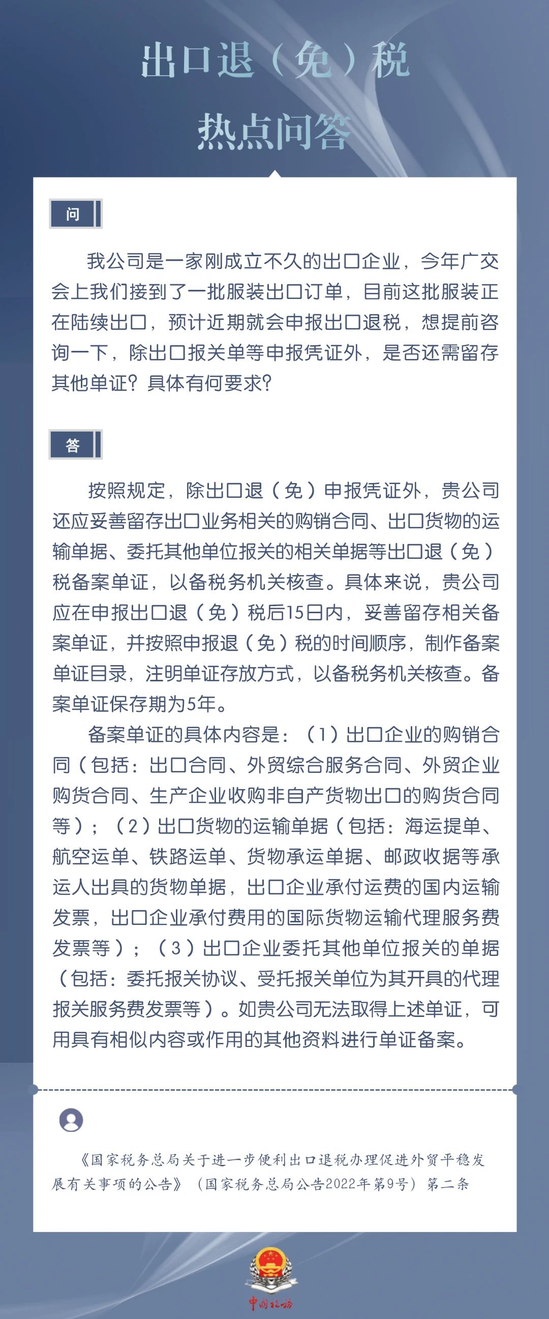 为进一步加力支持包括中小微企业在内的广大经营主体开展外贸出口业务,便于企业掌握出口退税现行规定、及时了解出口退税便利化举措,商务部、国家税务总局针对企业普遍关心的出口退税热点问题,整理了问答集锦。一起来看看吧↓