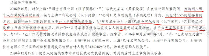 2016年10月,时任上海*甲服务有限公司(以下简称:*甲)总裁史某某(另案处理)在负责公司经营期间,为达到少缴个人所得税等避税目的,经与上海**有限公司总裁胡某某(另案处理)约定,以支付3.5%的服务费的方式,通过**公司控制的第三方平台以走账套现等手段,为*甲及其子公司上海*乙服务有限公司(以下简称:*乙)员工代发薪资及虚开增值税普通发票。后时任**公司华东区销售总监被告人何某某受胡某某指使,在明知无实际业务往来的情况下,与*甲、*乙工作人员对接联系操作代发薪资及虚开发票事宜。经审计,2016年10月至2018年7月,*甲、*乙先后虚受开具的增值税普通发票价税合计31540169.02元,涉案发票均入账使用。