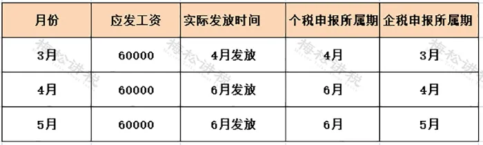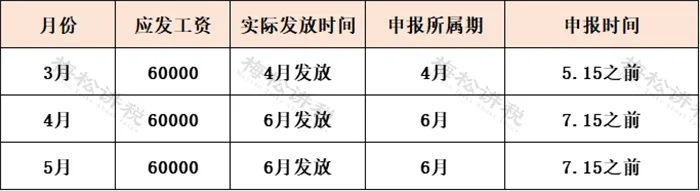 举例:A公司3-5月份的工资发放及个税申报时间如下表:
