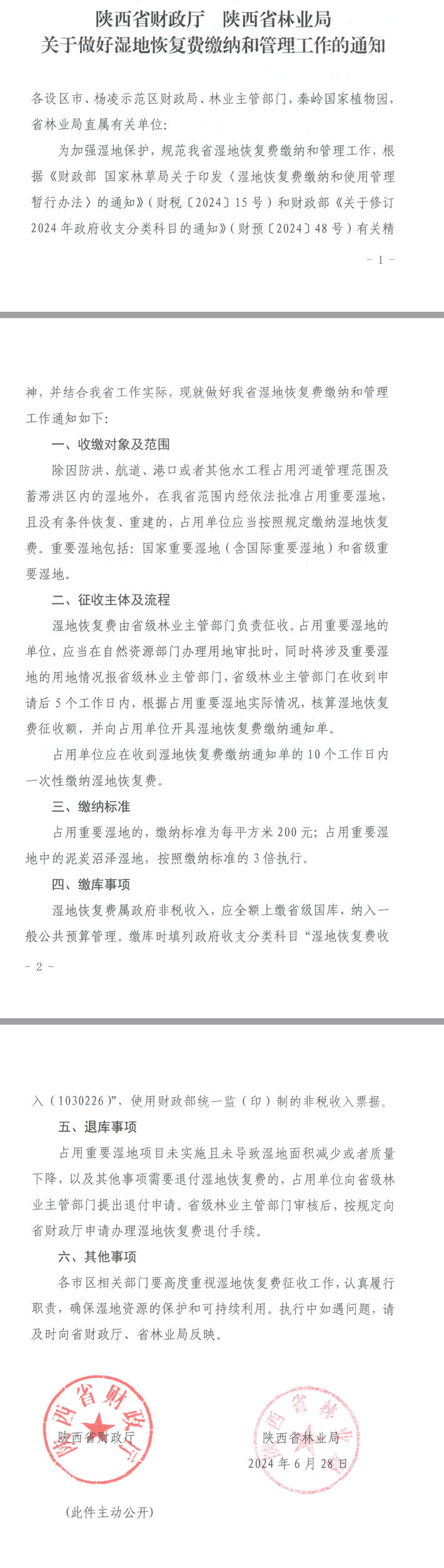 陕西省财政厅陕西省林业局关于做好湿地恢复费缴纳和管理工作的通知