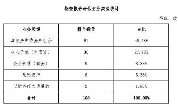 检查组按单项资产或资产组合、企业价值(非国资)、企业价值(国资)、无形资产和以财务报告为目的五类资产评估业务,共计抽取108份资产评估报告,对资产评估工作底稿和资产评估报告的规范性和完备性开展检查。检查中发现的主要问题如下: