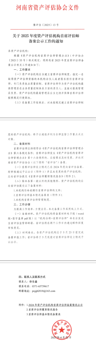 河南省资产评估协会关于2025年度资产评估机构首席评估师备案公示工作的通知