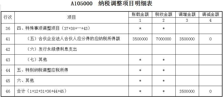 合伙企业当年宣告分配以前年度留存的利润500万元,法人合伙人收到分配款350万元,会计核算计入当年投资收益,由于该所得在以前年度已缴过企业所得税,因而应调减应纳税所得额。法人合伙人A公司《纳税调整项目明细表》(A105000)的填报如下图所示。