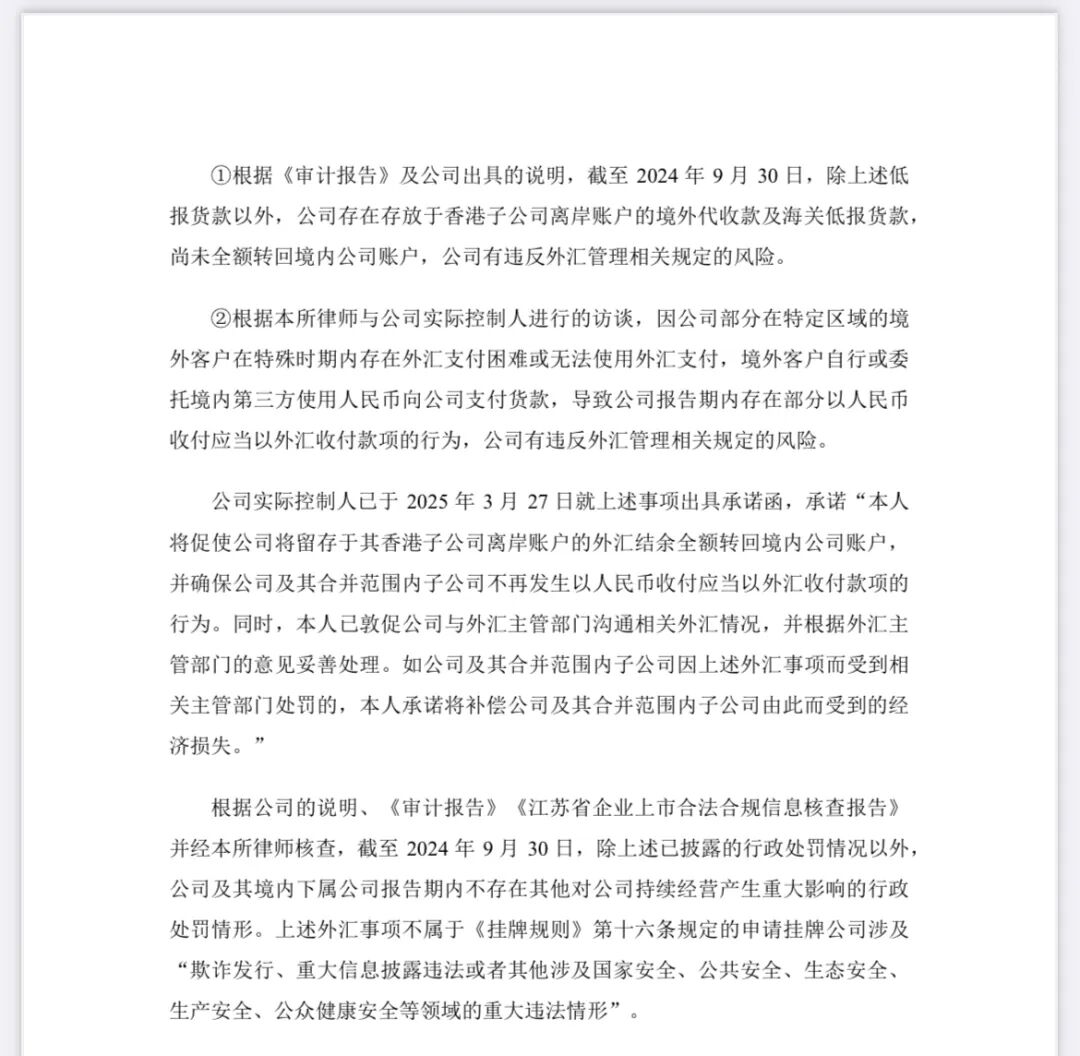①根据《审计报告》及公司出具的说明,截至 2024 年 9 月 30 日,除上述低报货款以外,公司存在存放于香港子公司离岸账户的境外代收款及海关低报货款,尚未全额转回境内公司账户,公司有违反外汇管理相关规定的风险。