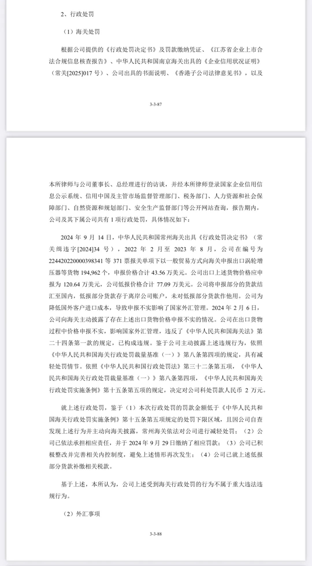 2024 年 9 月 14 日,中华人民共和国常州海关出具《行政处罚决定书》(常关缉违字[2024]34 号),2022 年 2 月至 2023 年 8 月,公司在编号为224420220000398341 等 371 票报关单项下以一般贸易方式向海关申报出口涡轮增压器等货物 194,962 个,申报价格合计 43.56 万美元。公司出口上述货物价格应申报为 120.64 万美元,公司低报价格合计 77.09 万美元。公司将申报部分的货款结汇至国内,低报部分货款存于离岸公司账户,未对低报部分货款作他用。公司为降低国外客户进口成本,导致申报不实影响了国家外汇管理。2024 年 2 月 6 日,公司向海关主动披露了存在上述出口货物价格申报不实的情况。公司在出口货物过程中价格申报不实,影响国家外汇管理,违反了《中华人民共和国海关法》第二十四条第一款的规定,已构成违规。鉴于公司主动披露上述违规行为,依照《中华人民共和国海关行政处罚裁量基准(一)》第八条第四项的规定,具有减轻处罚情节。依照《中华人民共和国行政处罚法》第三十二条第五项,《中华人民共和国海关行政处罚裁量基准(一)》第八条第四项,《中华人民共和国海关行政处罚实施条例》第十五条第五项的规定,决定对公司科处罚款人民币2 万元。