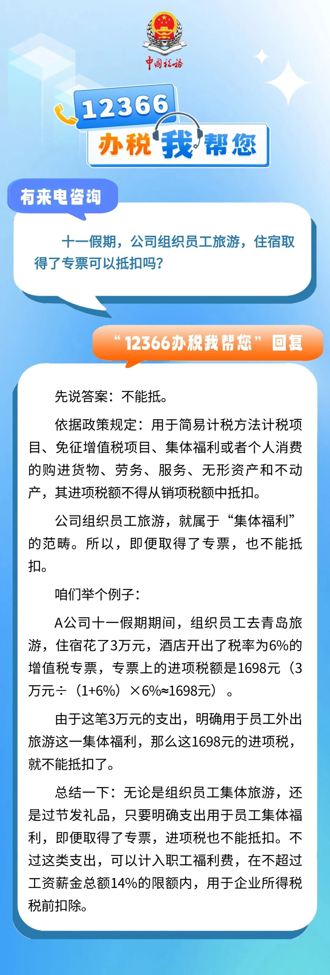 有来电咨询 :十一假期,公司组织员工旅游,住宿取得了专票可以抵扣吗?一起来看看回复吧↓