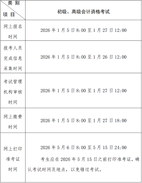 (三)2026年1月5日至1月27日,全国会计人员统一服务管理平台开通初级、高级会计资格考试报名。考试报名统一在1月27日12:00截止,缴费统一在1月27日18:00截止。报考人员应于1月26日12:00前完成信息采集。
