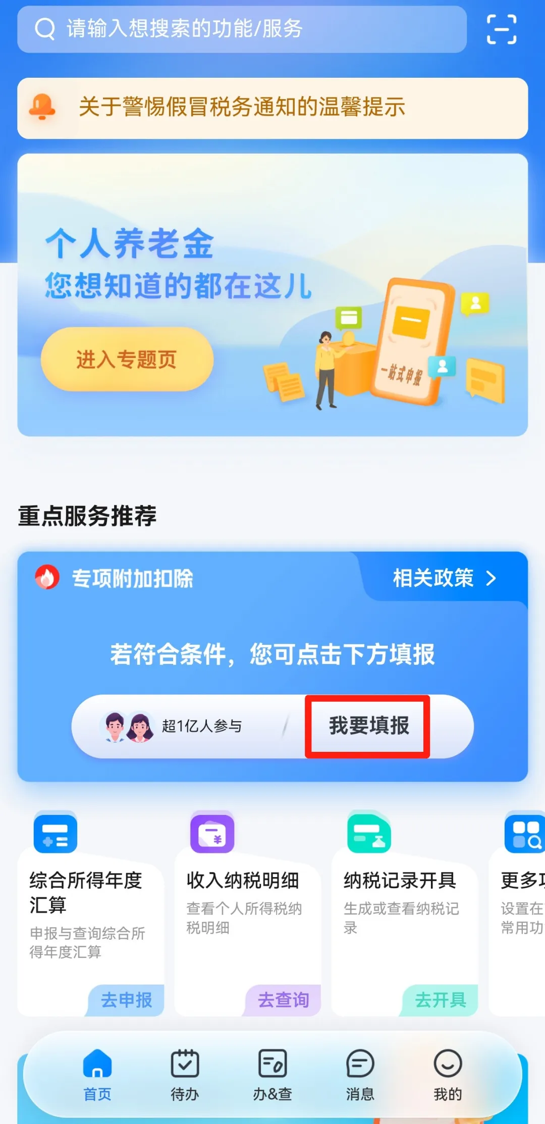 打开个人所得税App,在首页点击【我要填报】。