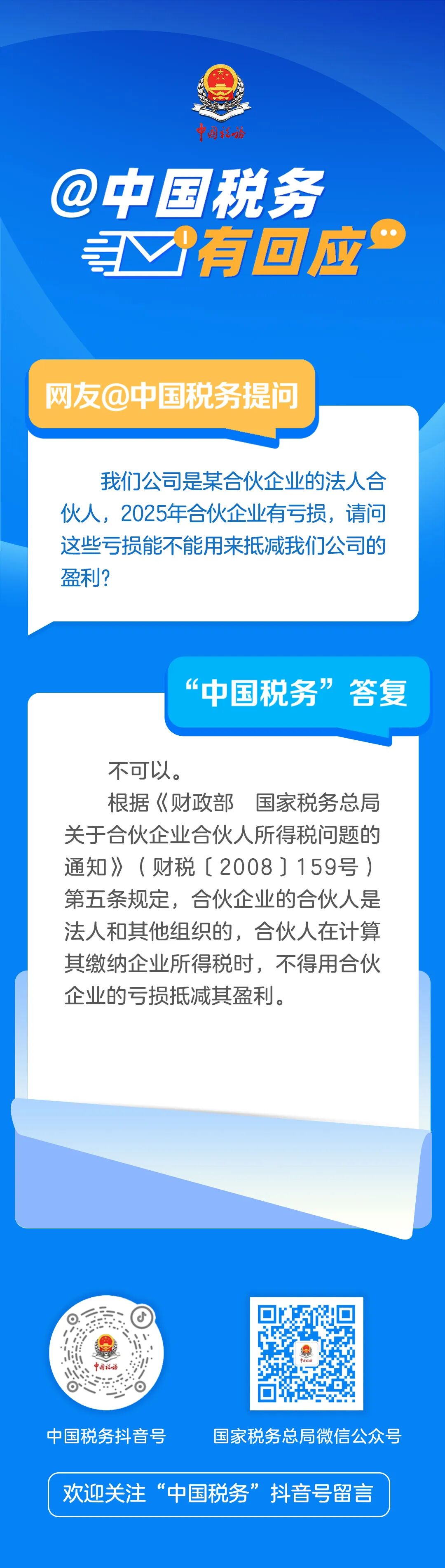 @中国税务有回应丨合伙企业有亏损,法人合伙人公司能用合伙企业亏损抵减公司盈利吗?