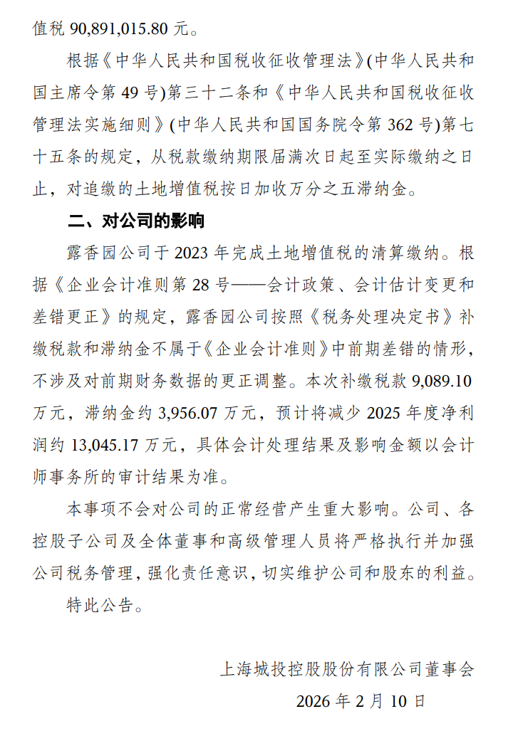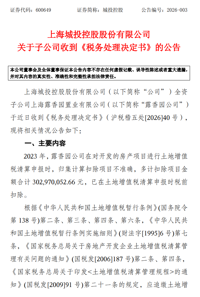 城投控股:多计扣除项目,被追缴土地增值税及滞纳金约1.3亿元
