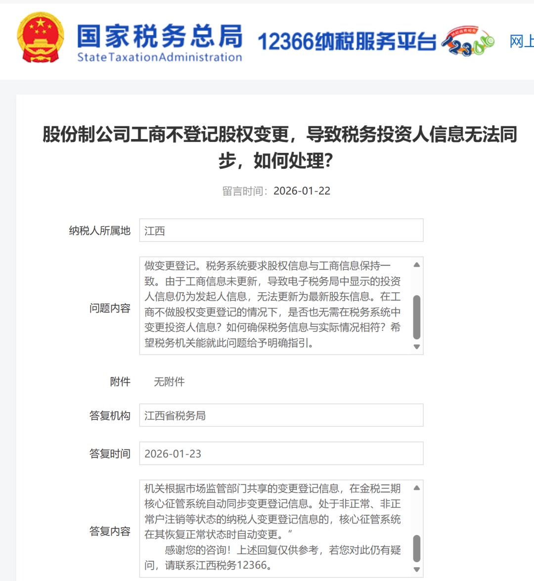 我公司为股份有限公司,股东在股权转让后已完成个人所得税和印花税的缴纳。而工商部门根据国家规定,仅登记股份有限公司的发起人及其出资比例,对后续股权变更不做变更登记。税务系统要求股权信息与工商信息保持一致。由于工商信息未更新,导致电子税务局中显示的投资人信息仍为发起人信息,无法更新为最新股东信息。在工商不做股权变更登记的情况下,是否也无需在税务系统中变更投资人信息?如何确保税务信息与实际情况相符?希望税务机关能就此问题给予明确指引。
