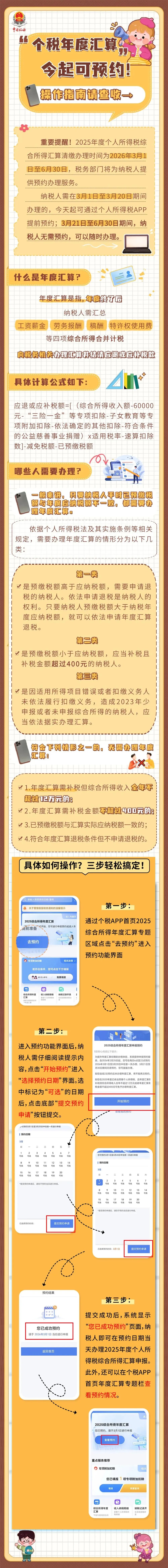 2025年度个税综合所得汇算清缴申报预约功能于2026年2月25日开通,纳税人如需在汇算初期(3月1日至20日之间)办理,可在2月25日起(每日6:00-22:00)通过个人所得税App预约上述时间段中的任意一天办理。
