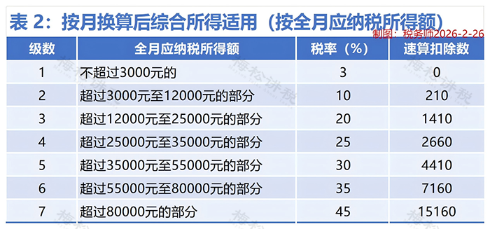 ①年终奖部分:80000÷12≈6666.67元,→ 匹配表2第2档(10%)